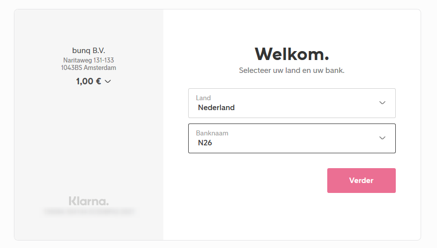 Sofort werkt bij N26 en andere banken eigenlijk net als N26 iDeal zou werken. Nadat je Sofort hebt geselecteerd als betaalwijze in de webshop wordt je doorverwezen naar een beveiligde omgeving van Klarna. Hierin moet je net als bij iDeal via je eigen bank de transactie bevestigen. We hebben het N26 iDeal proces hieronder in plaatjes weergegeven.
