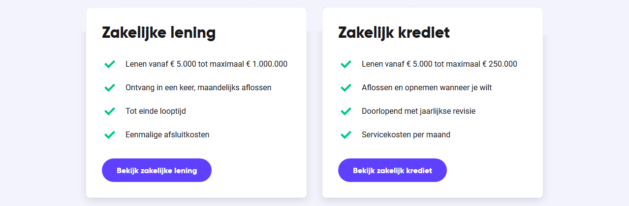 Een zakelijke lening is een eenmalige uitbetaling van € 5.000 tot € 1.000.000 voor een specifiek doel zoals een investering of bepaalde groeiplannen. Je betaalt de lening vervolgens terug in maandelijkse termijnen met een looptijd van minimaal 3 maanden tot maximaal 60 maanden. Je betaalt een vaste rente en een vast maandbedrag over de gehele looptijd en je kunt het afbetaalde deel niet opnieuw opnemen.